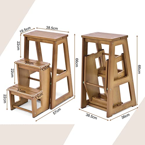 GOPLUS Sgabello Scala Pieghevole, Scaletta a 3 Gradini, in Legno, Multiuso e Pratico, Portata di 150 kg, 57x38,5x66 cm, Marrone/Naturale