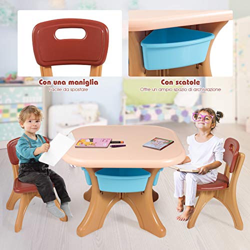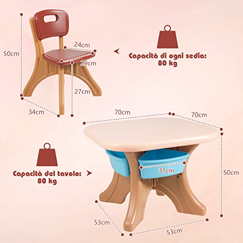GOPLUS Set di Tavolo con 2 Sedie per Bambini con 4 Contenitori, Tavolino e Sgabelli in Plastica, Robusto e Facile da Pulire, Facile Montaggio (Marrone)