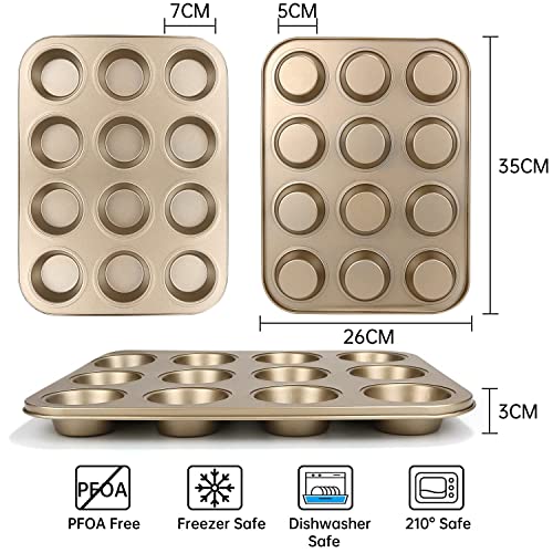 Gordnwe Stampo per Muffin in Acciaio al carbonio, Stampini da 12 Muffin, Teglia da Forno Muffin Antiaderente per Cupcake e Crostatine, Madeleine, Budino, Brownie, 2 Pezzi(Oro)