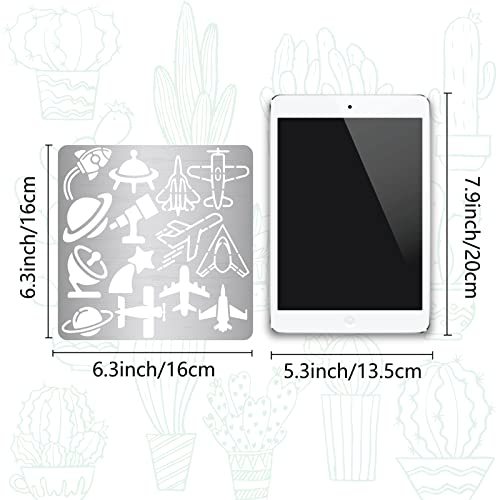 STENCIL IN METALLO: viene fornito con 1 pezzo di modello di giornale stencil in metallo da 6.3x6.3 pollici, progettato con veicoli spaziali, lanciarazzi, ricevitori di segnale, modelli di pianeti, eccetera, pratico e riutilizzabile