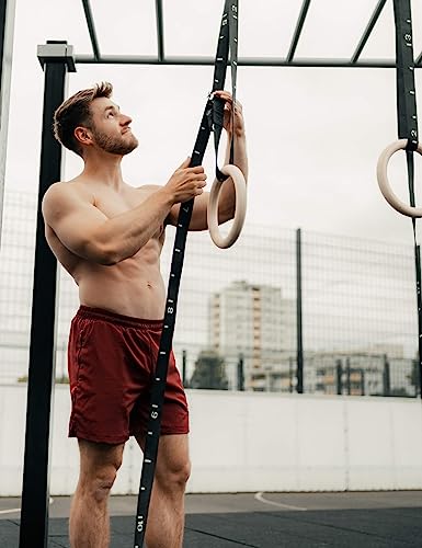 Uso versatile - Gli anelli da ginnastica in legno possono essere utilizzati in modo flessibile all'interno e all'esterno con le cinghie lunghe 4,5 m, ad esempio per gli allenamenti calistenici all'aperto o per il fitness in palestra e a casa.