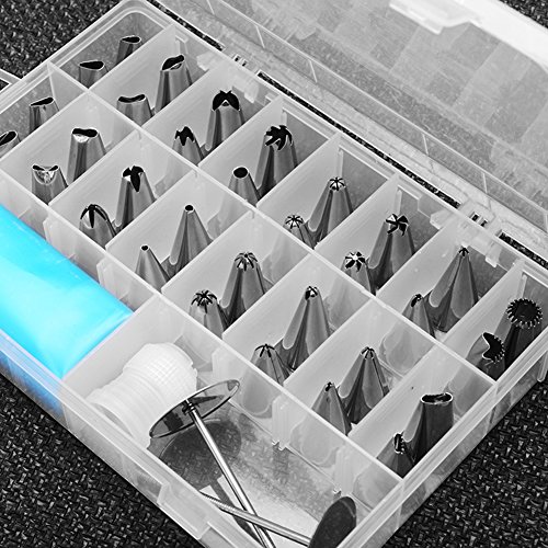 Si tratta di un set di decorazioni per torta con cui è possibile creare tutti i tipi di disegni. Include 32 beccucci in acciaio inossidabile, 2 tasche in silicone (riutilizzabili, da 25,4 cm), 2 attacchi in plastica (riutilizzabili), 1 chiodo per realizzare i fiori e 1 scatola.