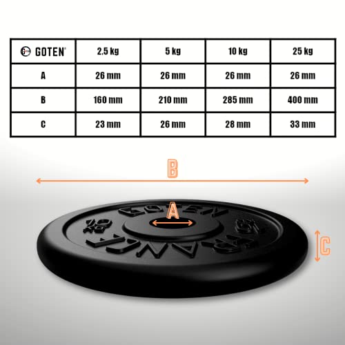 IMPORTANTE ●● Il diametro del foro è di 26 mm, adatto per barre (corte, lunghe, diritte, curve) di 25 mm. Disponibile anche in diametro 31 e 51 mm (Visita lo Store di GOTEN). INCISIONI su entrambi i lati del disco. Peso in kg. Precisione 5%.