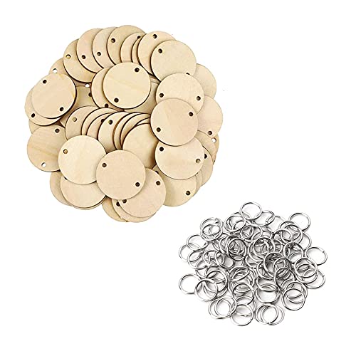 Gotetiso Dischi di Legno Rotondi con Foro 100 Pezzi Cerchi Legno Tondo Grezzi Anelli Rotondi in Legno con Fori Ciondolo in Legno Dischi in Legno e 100 Pezzi di Anelli in Metallo