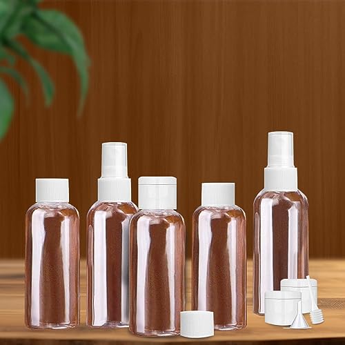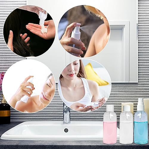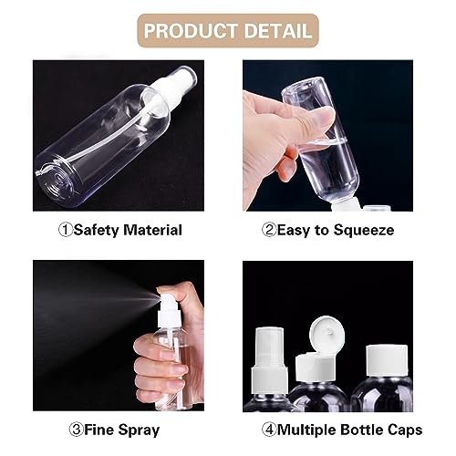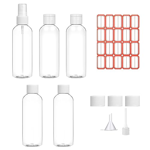 GOTFUN 5 bottiglie da viaggio trasparenti da 80 ml, con coperchio, etichette, imbuto e ugelli spray, ricaricabili, piccole pompe di plastica vuote e bottiglie spray, per cosmetici, viaggi
