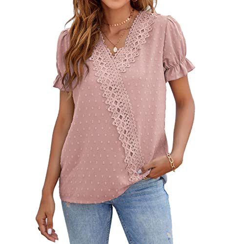 GOTOTOP Camicie Estive a Pois con Scollo a V per Donna, Elegante Camicetta Manica Svasata a Maniche Corte con Ricamo in Pizzo(M-Rosa)