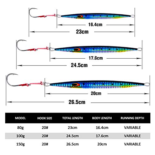 Maschere per acqua salata: le maschere verticali con peso sono 80 g, lunghezza del corpo 16,4 cm. 1 pezzo per confezione, blu. Il gancio è realizzato in acciaio al carbonio resistente alla corrosione con punte sul gancio. Il filo in acciaio inox ispessito resiste efficacemente alle condizioni più difficili