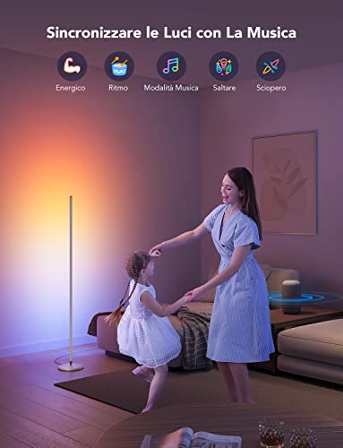 Sincronizzazione con la Musica: Aumenta il tempo di film, feste, giochi o sessioni di ascolto con la lampada da terra, il colore e la luminosità della lampada da terra a LED cambieranno contemporaneamente al variare della musica o dell'audio di gioco.
