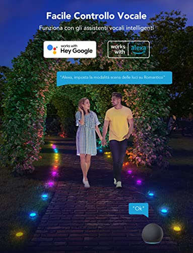Metodi di Controllo Intelligenti: Govee faretti da giardino per esterni di sono controllabili tramite App con Govee Home App via Wi-Fi e Bluetooth, e anche a comando vocale grazie all'accoppiamento con Alexa o Google Assistant.