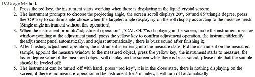I.Introduzione:/ Il parametro tecnologico del glossmetro è completo secondo lo standard internazionale ISO2813, ASTM D523 e lo stato standard GB9754-88, GB9966.5. Tutti gli elementi della prestazione soddisfano i requisiti di lavoro di prima classe dello stato JJG696-2002 (Lens Luster Degree Instrument Measure Test Regulations)./ Autocalibrazione, non c'è bisogno di essere regolazione manuale./ Calibrare in base allo standard fornito (piastrella di calibrazione)/