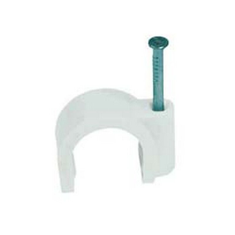 Graffetta fissacavo con chiodo in acciaio temperato gi? inserito nella graffetta di materiale termoplastico, di colore bianco