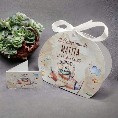 PV Grafik 24+24 pezzi | Scatola Portaconfetti personalizzata con nome e data n. 24 scatole confetti + 24 Bigliettini Bomboniera, nastrino per chiusura incluso (Aereo 27)