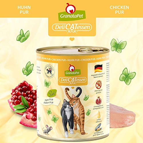 GranataPet DeliCatessen PUR con pollo, alimento umido gatti, cibo gatti senza cereali e zuccheri aggiunti, scatolette per gatti con alto contenuto di carne e oli salutari, 6 x 800 g