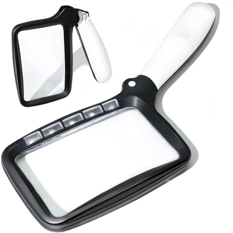 Colore come mostrato Dimensioni: 18*12*93 cm Peso: 222 grammi Lenti trasparenti grandi e larghe: l'obiettivo principale della lente d'ingrandimento è 11x6,4 cm, la lente d'ingrandimento rettangolare ampia e ampia fornisce immagini di alta qualità senza distorsioni, coprendo un ampio campo visivo e riducendo l'affaticamento degli occhi. (non adatto per mancini ) 5 LED e 2 modalità di regolazione della luminosità: 5 LED garantiscono una buona illuminazione e una visione chiara e la modalità regolabile ti consente di scegliere un'illuminazione intensa o soffusa in base alle tue esigenze per ridurre l'affaticamento degli occhi da ridurre con la lettura notturna. Manico pieghevole: il design della maniglia pieghevole riduce le dimensioni della lente d'ingrandimento e lo rende più comodo da trasportare e riporre. Ingrandimento ad alta risoluzione: la lente d'ingrandimento ha un'alta risoluzione e un'elevata trasmittanza, l'ingrandimento è 2X, l'effetto di ingrandimento perfetto è utile per