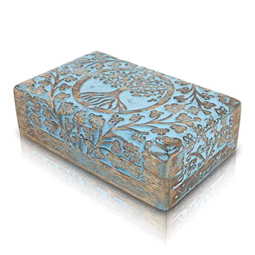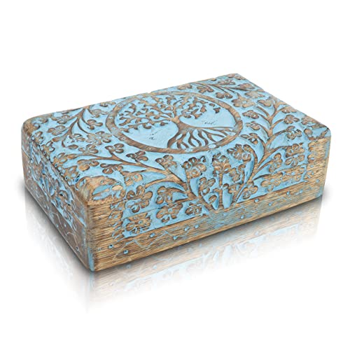 Alta qualità: cerniere resistenti. Dura per sempre. Look & feel rustico con una splendida finitura blu lavaggio, che distingue questa scatola. Una bella scultura fatta a mano di The Tree Of Life con tagli floreali e scanalature decorano la superficie della scatola