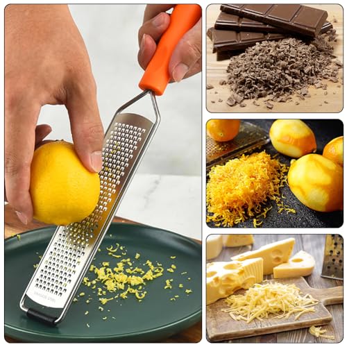 Design multifunzionale: lo zester di alta qualità è uno degli strumenti più durevoli in cucina. Puoi usarlo per macinare vari tipi di frutta e verdura come limone, lime, agrumi, parmigiano, formaggio, spezie, noce moscata, cannella, cioccolato, ecc. Puoi usarlo anche per rimuovere i bordi tostati di biscotti e pane.