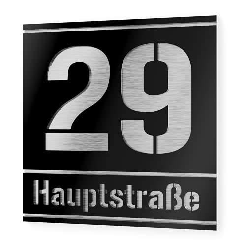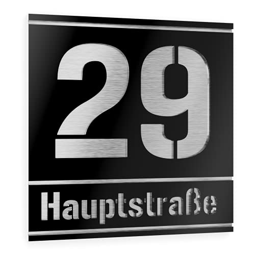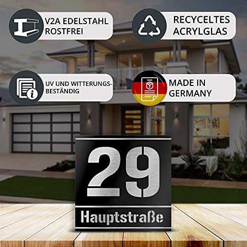 Graviers Design Numero civico personalizzabile in vetro acrilico + acciaio inox V2A 380 x 380 mm Nero, Resistente alle intemperie, Antiruggine, Targa per porta d'ingresso, Made in Germany