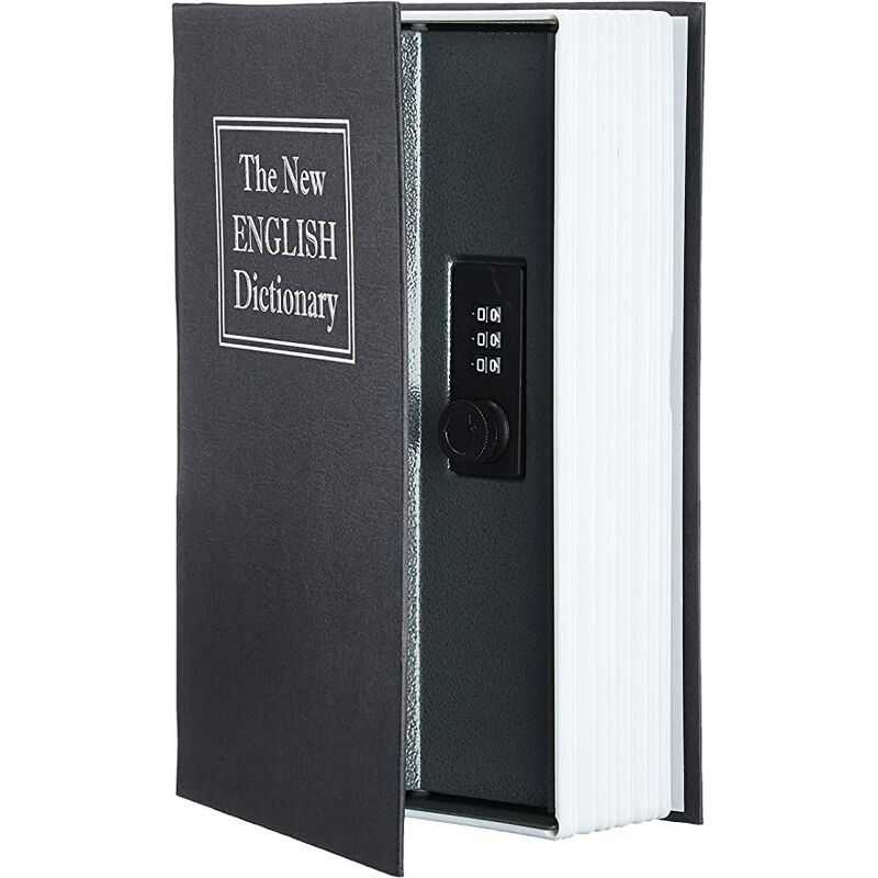 Cassaforte portatile che sembra un libro, ideale per nascondere piccoli oggetti di valore su uno scaffale. Il tessuto della copertina e del retro sono progettati per sembrare un libro. Non contiene pagine. Si consiglia di riporlo tra 2 libri su uno scaffale. Il coperchio si solleva per rivelare il coperchio della cassaforte. Serratura a combinazione a 3 cifre. Progettato per prevenire i furti. Spazio portaoggetti per nascondere contanti, carte di credito, documenti importanti, gioielli, ecc. Ideale per viaggiare o per la casa