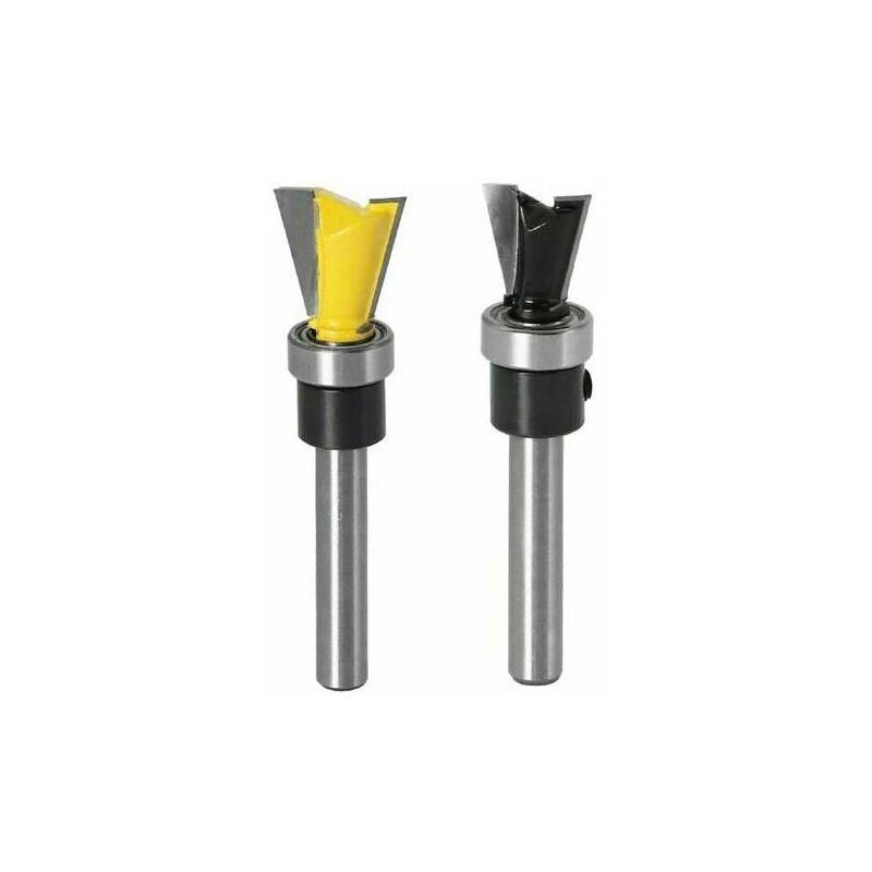 Punte a coda di rondine, due scanalature, gambo da 6,35 mm (1/4'') con guida del cuscinetto montata sul gambo. Fresa nera - Angolo di taglio: 10°;