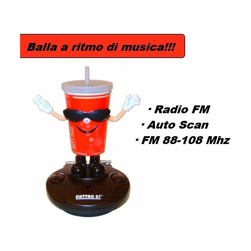 Piccola e potente radio a forma di lattina che balla a ritmo di musica! - Tasto accensione regolazione volume - Tasto reset - Tasto Scan - Vano batterie - Antenna telescopica - Altoparlante - Tasto azione movimento