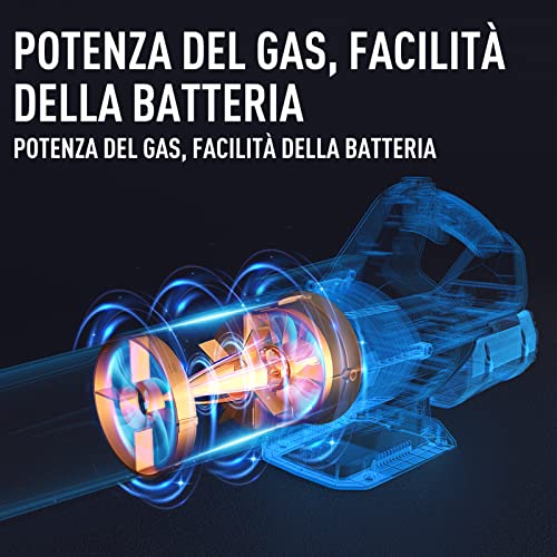 【POTENTE MOTORE BRUSHLESS E TECNOLOGIA A TURBINA】Il soffiatore a batteria GREEN MACHINE (soffiatore per neve) è dotato di un motore brushless ad alta tecnologia che fornisce il 30% in più di potenza e il 50% in più di durata rispetto ad uno tipico. La tecnologia turbofan consente di ridurre il rumore e di fornire una maggiore potenza.