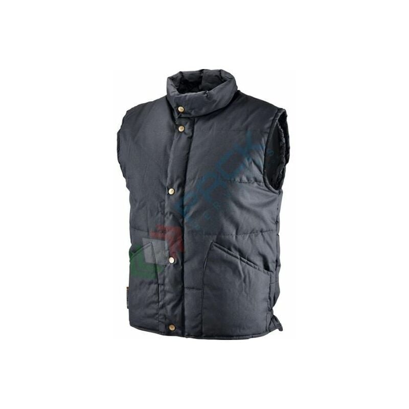 Gilet da lavoro bicolore 65% poliestere-35% cotone, peso 200 gr/m2. Realizzato con due doppie tasche esterne in vita con cerniera, patta e velcro, una tasca al petto lato sinistro con patta e velcro, un doppio taschino al petto lato destro con patta e velcro, una tasca al petto parte superiore lato destro con patta e velcro e porta badge a scomparsa, fettuccia con anello a D ed un tascone posteriore con chiusura a velcro. Chiusura frontale con cerniera ed impunture e rifiniture colorate a contrasto. Colore blu, taglie disponibili dalla M alla XXL