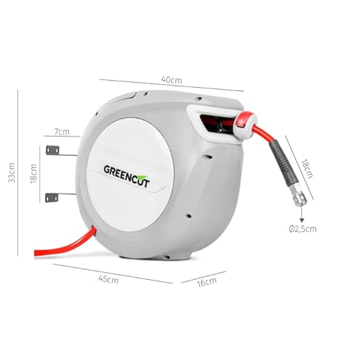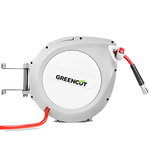GREENCUT MNA100 - Avvolgitubo flessibile per aria compressa da 10 m con avvolgitore automatico, staffa a parete e pressione di esercizio di 8 bar