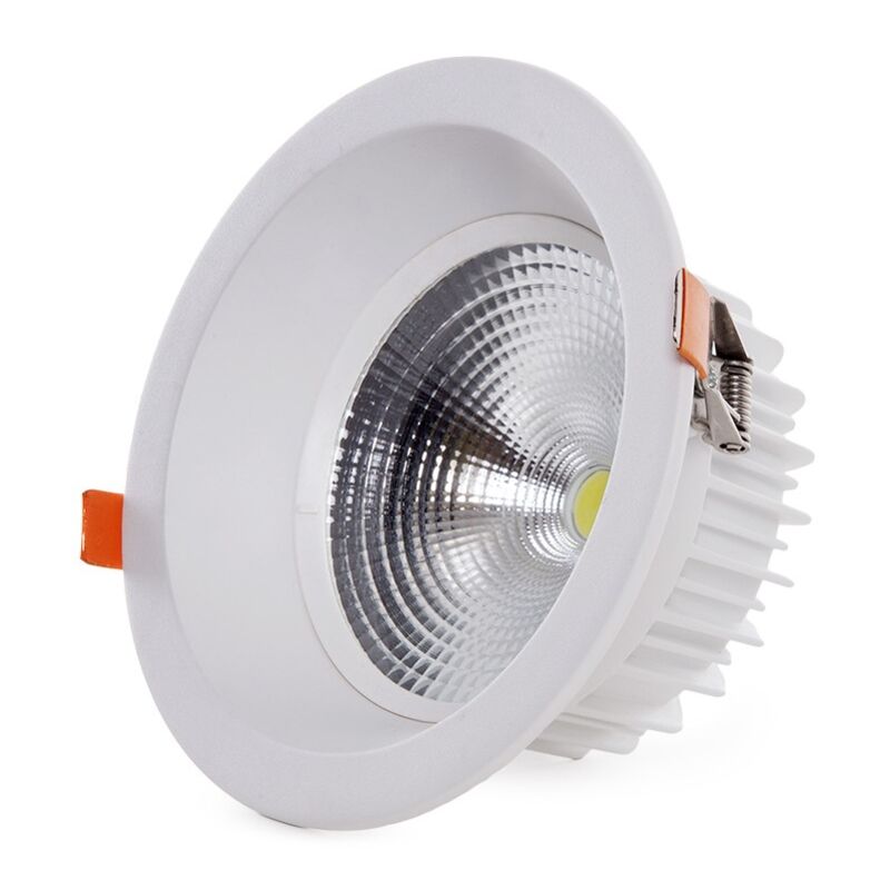 Il Downlight LED circolare da 230 mm di diametro con uno spessore di (105 mm), offre soluzioni per uffici, fabbriche, supermercati, negozi e per uso residenziale. Può essere installato direttamente su prese alimentate dalla rete elettrica (85-265VAC) con frequenza di servizio 50/60Hz. Ha un'elevata efficienza (100 Lm/W ) consumando 24W tramite un LED di tipo COB e riuscendo a fornire un flusso luminoso di 2400Lm distribuito uniformemente attraverso un diffusore trasparente antiabbagliante dal quale si ottiene un indice di resa cromatica di 80. Fornisce un'illuminazione equivalente ad una incandescenza da 180W lampadina, il suo consumo rappresenta un valore di 24kWh/1000h, riducendo la quantità di energia fatturata e le emissioni di gas inquinanti nell'atmosfera. Questo downlight è alimentato da un driver non dimmerabile incluso nella confezione. pacchetto da collegare direttamente alla rete, con connettore di uscita compatibile con il collegamento del downlight (45-90VDC, 280mA)