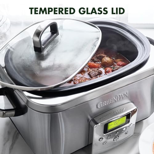 GreenPan Elite 8-in-1 Slow Cooker programmabile da 6L,coperchio lavabile in lavastoviglie e vassoio rimovibile, ceramica sana senza PFAS antiaderente, cottura,soffritto,cestello a vapore,arrosto,inox