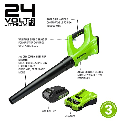 Greenworks Tools Akku Axial-Leafblower G24ABK2, agli ioni di litio 24 V 160 km/h, 4,27 m³/min volume d'aria, controllo elettronico della velocità con batteria da 2 Ah e caricabatterie