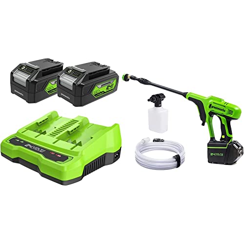 Greenworks Tools Due Batterie da 24 V 4 Ah G24B4 e Caricatore a Due Posti G24X2C & G24PW Idropulitrice a Batteria - 24 Bar, 180 L/ora, 300W