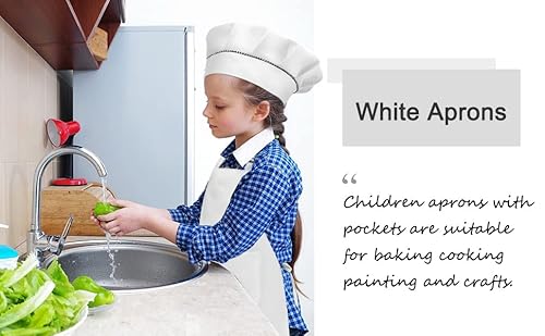 3 Set Grembiule Bambini e Cappello Cuoco, Bianchi Grembiule Cuoco Bambino, Regolabili Grembiuli da Chef Bambini, Grembiule da Forno Bambini,Grembiule Cucina Per Bambini con 2 Tasche Per Età 6-13 Anni
