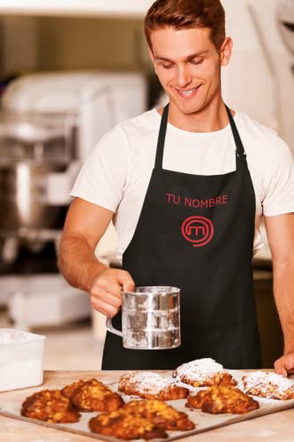 Grembiule da cucina personalizzato con nome ricamato, Poliestere-cotone bianco o nero, con logo Masterchef (nero), Nero, Taglia unica