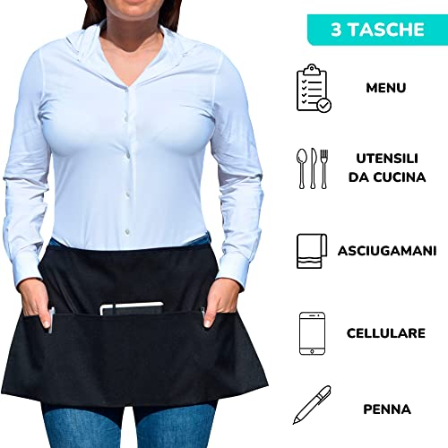 【 VARI SETTORI 】 Parannanza corta adatta per il settore alberghiero, la cucina, ristoranti, hotel, parrucchieri o panetterie. Ha il vantaggio di dover essere lavata molto meno di un grembiule nero corto comune grazie al trattamento antimacchia che include. Potrebbe durare un'intera settimana o anche di più senza bisogno di lavarlo.