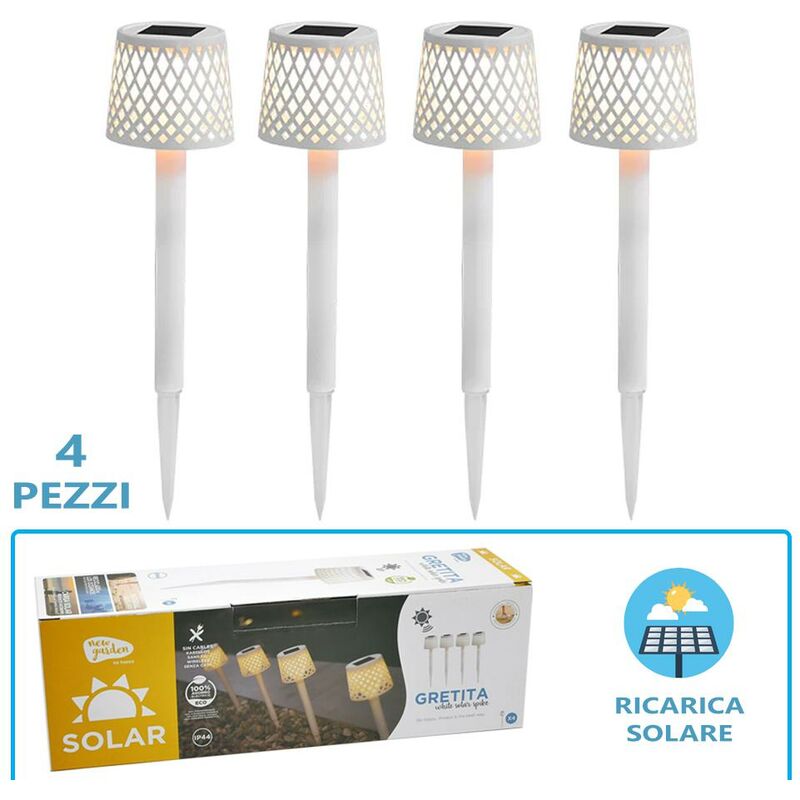 Gretita Puntale solare da giardino (4 pezzi) - Colore bianco .La lampada solare Gretita un puntale da giardino a carica solare. fatto di plastica riciclata e ha un pannello solare in cima per la ricarica. Posizionatelo nei camminamenti, vicino alla piscina o anche in una fioriera, la versatilit di questa luce solare da giardino senza limiti. Con il suo sensore crepuscolare puoi dimenticarti di accenderlo o spegnerlo, poich si accender automaticamente quando rileva che la luce del sole sta diminuendo. .La lampada solare Gretita fatta con materiale riciclato dagli oceani, un prodotto sostenibile, dando una nuova vita ai rifiuti di plastica sotto forma di lampada. Disponibile in bianco o nero..Ogni scatola contiene 4 GretitasCaratteristiche tecniche Versione SOLARE + BATTERIA RICARICABILE (USO INTERNO ED ESTERNO)::LUCE INCLUSA=SÌ:COLORE DI LUCE=3000°K (BIANCO CALDO):POTENZA (LUMEN)=2 Lm:TIPO DI ATTACCO=LED INTEGRATO:CARICA SOLARE=SÌ:AUTONOMIA DELLA CARICA SOLARE*=MASSIMO