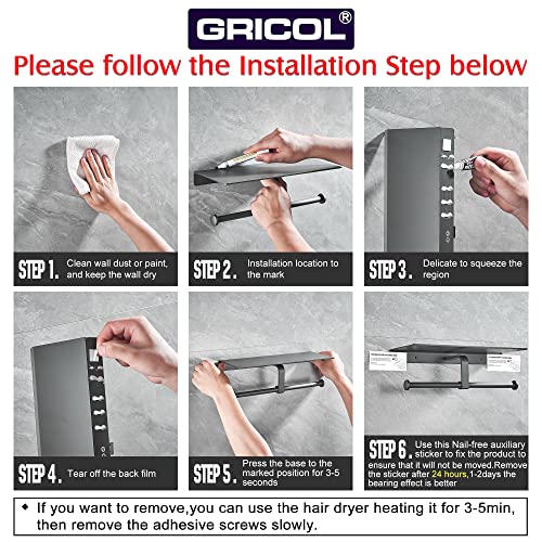 Gricol Porta Carta Igienica con Ripiano Senza Foratura per Telefono Cellulare Portarotolo Doppio Montaggio a Parete per Bagno (Grigio)
