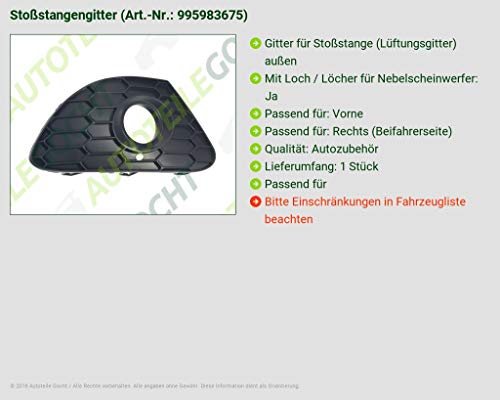 Griglia per paraurti (griglia di ventilazione) esterno, con foro/fori per fendinebbia: sì, adatto per: frontale, adatto per: destro (lato passeggero), qualità: Auto accessori, contenuto della confezione: 1 pezzi