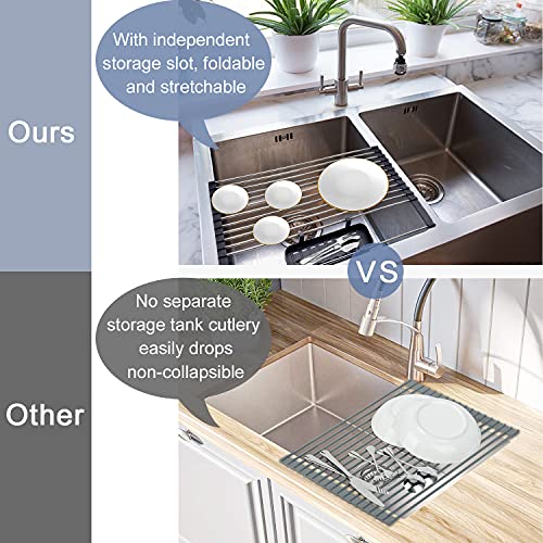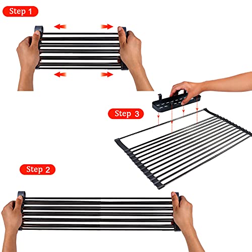Salvaspazio: facile da riporre, salvaspazio per la cucina. Grazie alla funzione telescopica, si adatta a qualsiasi lavello e può essere facilmente riposto. Cinturino in silicone antiscivolo: si fissa saldamente al lavello, si apre rapidamente per evitare che il telaio non cada nel lavandino per proteggere il lavello e i banconi da graffi.