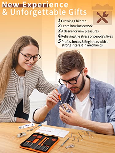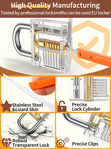 ✅[Miglioramento della Qualità] Tutti i plettri sono realizzati in acciaio inossidabile liscio di alta qualità, che non si deforma o si rompe facilmente. La maniglia arancione ha un design opaco antiscivolo, una presa eccellente e un tocco confortevole, che ti consente di sbloccare più liberamente. Dotato di impugnatura allungata che permette di risolvere angoli più difficili.Il cilindro della serratura è preciso senza parti staccate o perni.