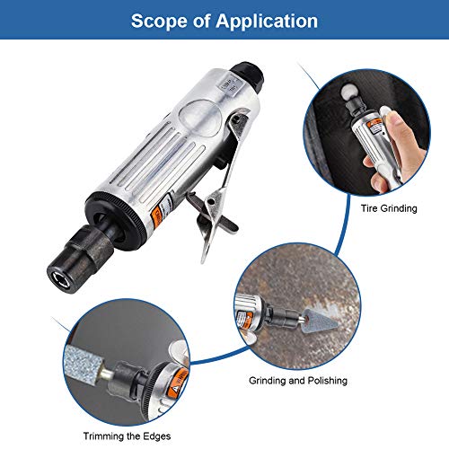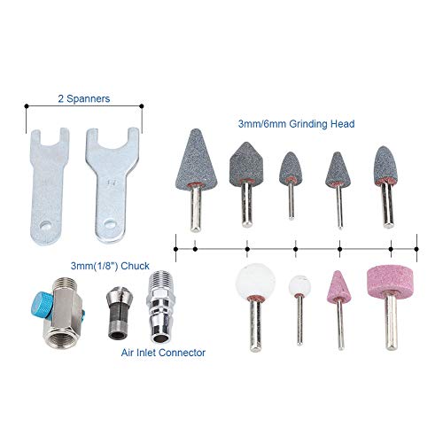 Professional Kit Air Grinder: Alta qualità smerigliatrice dell'aria per la molatura, lucidatura, smerigliatura pneumatici, levigatura, rimozione della ruggine, ecc Viene fornito con la smerigliatrice, chiave, 3mm (1/8 ") Chuck / 6mm (1/4") Chuck and Grinding Head, pratico e pratico kit macinino che offre la massima flessibilità per la maggior parte delle esigenze di levigatura e lucidatura