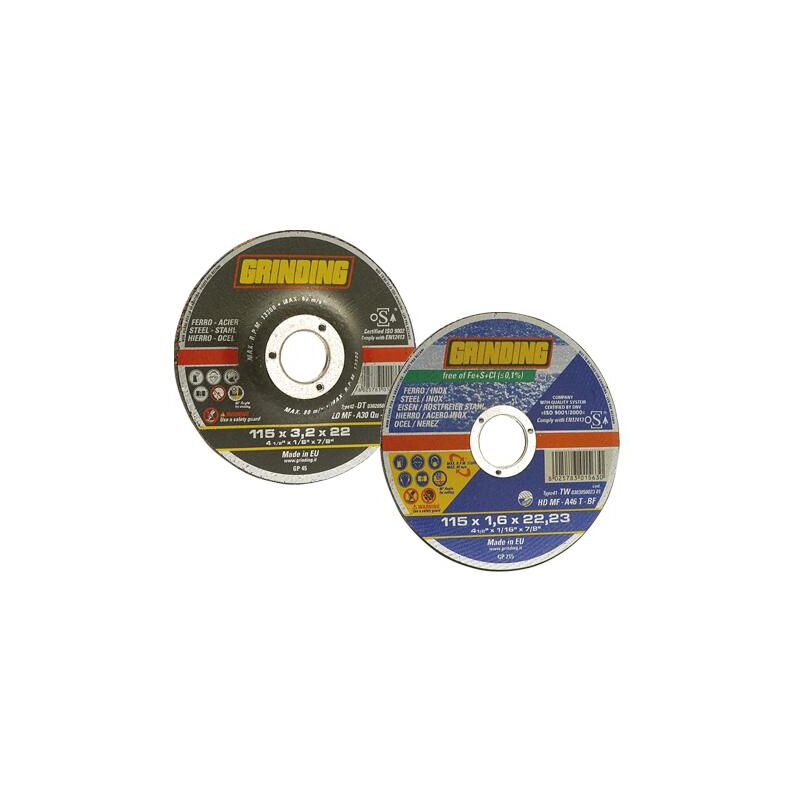 Dischi Grinding abrasivi per ferro Abrasivo all' ossido di alluminio. Disco da taglio. Applicazione: ferro, acciaio inossidabile, acciaio ad alta resistenza, materiali ferrosi. Certificazioni OSA - EN 12413 Ø 230x2,4 mm. - foro 22 centro depresso