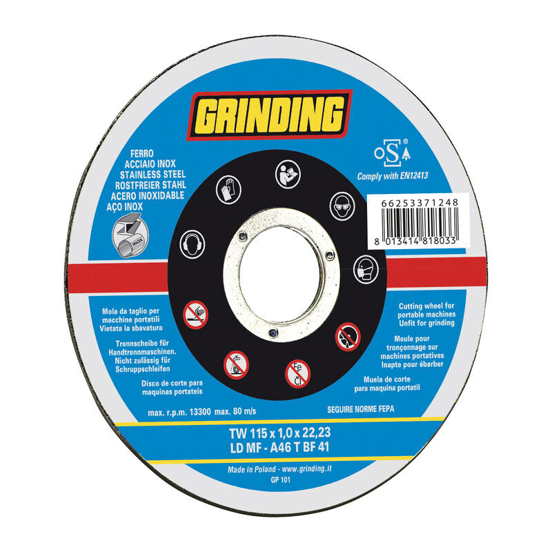 Mod. 'Tw-Ldmf' Resinoidi Rinforzate Piane. Per Applicazioni Nell Industria Di Acciaio Inox E Ferro E Per Il Taglio Di Lamierati E Particolari In Acciaio E Acciaio Inox. Foro 22,2 Mm Diametro 115 Mm Spessore 1,0 Mm.