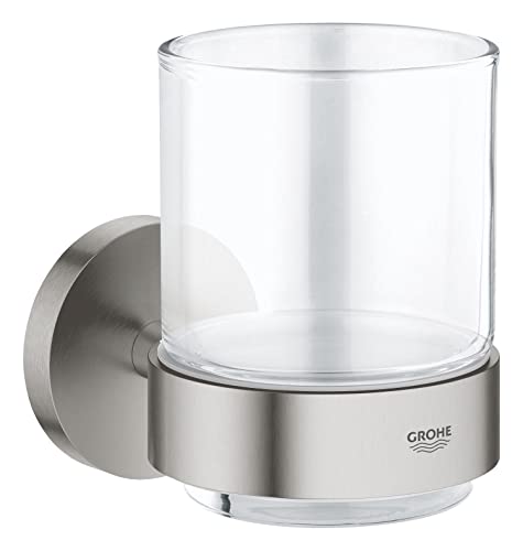 GROHE QuickFix Start, Bicchiere in vetro con supporto metallo e vetro, fissaggio nascosto, viti e tasselli inclusi, montaggio facile con GROHE QuickGlue, 106 x 99 mm, Super Steel, 41194DC0
