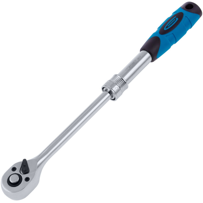 GROSS - Chiave a cricchetto telescopica 3/8" - 215-315 mm • Chiave a cricchetto telescopica • Regolabile da 215 a 315 mm • Robusta e resistente Pratica! La chiave a cricchetto telescopica GROSS è progettata per essere utilizzata con inserti e bussole con attacco quadrato da 1/2". È particolarmente utile per lavorare in luoghi di difficile accesso e regolare al meglio la tua forza grazie al suo sistema telescopico brevettato: la sua lunghezza è regolabile da 215 mm a 315 mm. Resistenza ed efficienza La chiave è realizzata in acciaio al cromo vanadio di alta qualità che le conferisce proprietà di resistenza superiore. Inoltre, è rivestita in cromo che la protegge dalla corrosione. Il suo cricchetto a 72 denti e il passo di 5 gradi offrono un utilizzo fluido e una precisa serratura. Meccanismo telescopico Comfort d'uso Questa chiave ha un meccanismo telescopico che consente di passare dalla dimensione standard di 215 mm a una dimensione di 315 mm . Ciò consente di raggiungere luoghi