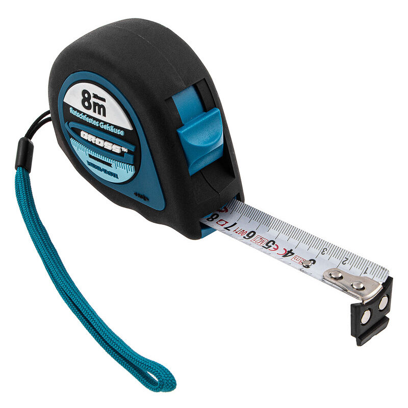 GROSS - Metro "Ergonomisch" - 8 m x 25 mm Metro 8 m con impugnatura in gomma magnetica. Plastica ABS resistente agli urti. Il metro "Ergonomisch" di GROSS consente di misurare lunghezze fino a 8m . Ideale per accompagnarti in qualsiasi tipo di cantiere: ristrutturazioni, costruzioni, ecc. La sua progettazione, pensata per i fai-da-te, garantisce un utilizzo ottimale e risponde a tutte le esigenze! Precisione ed efficacia Dispone di un gancio magnetico in gomma TrueZero, che consente un'eccellente aderenza su superfici piane e curve e misurazioni con una precisione maggiore. Infatti, il sistema TrueZero garantisce che il nastro sia ben calibrato. Il gancio regolabile consente di compensare eventuali imprecisioni se necessario. Il suo corpo ergonomico rivestito in gomma consente una presa eccellente e una resistenza a eventuali cadute e urti. Inoltre, dispone di un' asola per il polso che limita i rischi di caduta. Il suo gancio per cintura consente di averlo sempre a portata di mano