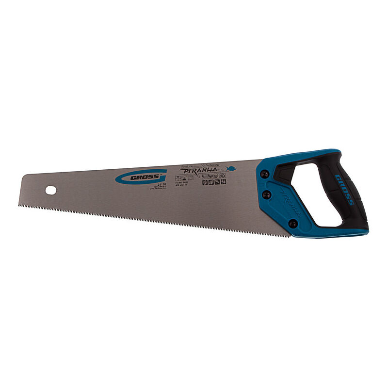 GROSS - Sega per legno "Piranha" - 400 mm Sega "Piranha" 11-12 TPI, denti 3D, denti temprati, impugnatura ergonomica bicomponente. Taglio efficiente. Robusta e resistente. Tagliare il legno non è mai stato così semplice! La sega per legno "Piranha" di GROSS è progettata per tagliare legno, truciolato, pannelli in fibra di legno e materiali come polistirolo espanso o poliuretano. Permette sia tagli longitudinali che trasversali e garantisce un'alta qualità di taglio grazie a tutti i suoi attributi! Design robusto ed efficienza migliorata La lama in acciaio giapponese di alta qualità e i suoi denti affilati permettono un taglio netto e preciso. Inoltre, il design assicura un'elevata resistenza e riduce al minimo il rischio di rottura, con denti temprati tramite un processo di induzione. La lama è rivestita con un rivestimento in polimero che la protegge dalla corrosione. Comfort d'uso L'impugnatura dello strumento è realizzata in resistente plastica ABS ed è ergonomica . Questi