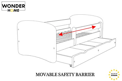 KIT COMPLETO - Con una rete a doghe in legno di pino, materasso in schiuma 8cm con cerniera (in modo che il coprimaterasso possa essere lavato facilmente), La sponda di sicurezza (mobile) e cassetto, che può essere montato su entrambi i lati del letto