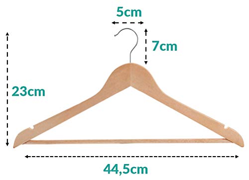 VOLUME DI CONSEGNA: set di 20 grucce in legno con barra e tacche. Composto da legno naturale finemente levigato e metallo cromato. Dimensioni: lunghezza 44,5 cm circa, altezza 23 cm circa.
