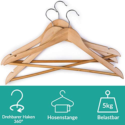20 Grucce Appendiabiti in Legno Naturale - Con Barra Portapantaloni - Gancio girevole a 360° - Per Camicie, Magliette e pantaloni