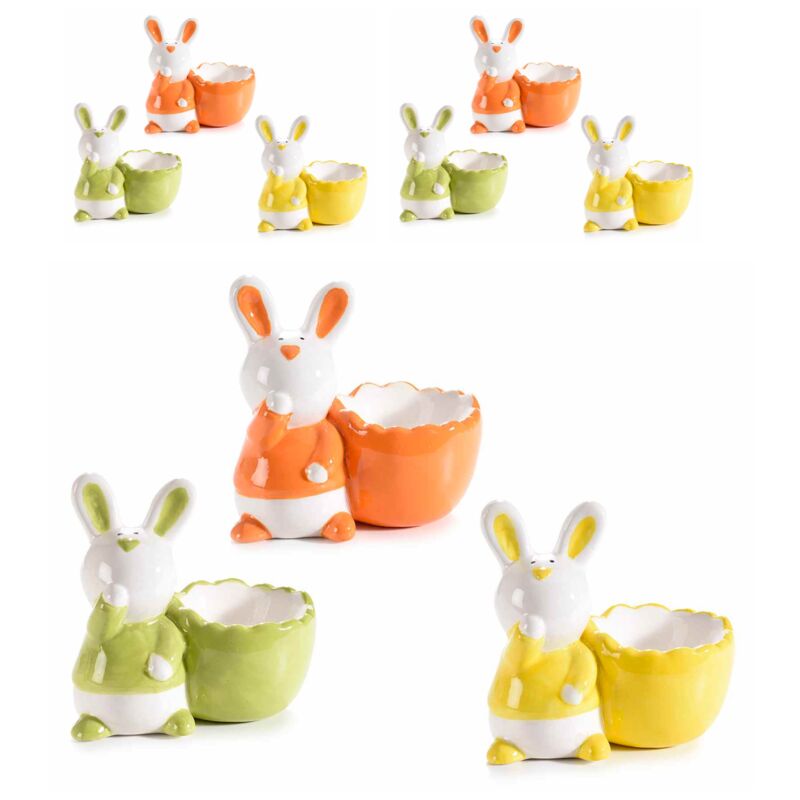 Elegante set di porta uovo Pasquali in ceramica con coniglietto decorativo. In set da 6 pezzi sono assortiti in 3 diversi colori come in foto. Possono essere usati come elemento decorativo della cucina, come segnaposto per la tavola Pasquale personalizzandoli con un uovo con scritto il nome del commensale o per riempirli di cioccolatini e dolciumi da regalare. Ciascun misura base 8,5 x profondit 5 x altezza 8 centimetri.